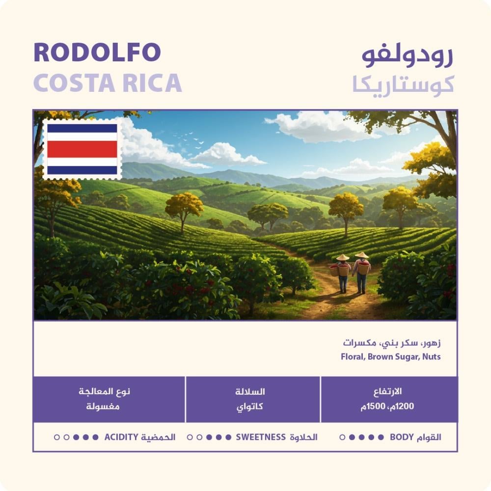 من مزارع كوستاريكا، تأتيك قهوة رودولفو بسلالة كاتواي ومعالجة مغسولة تبرز نكهات زهرية وسكر بني ولمسة مكسرات خفيفة. قوام كريمي، حلاوة طبيعية، وحمضية متوسطة تجعل منها تجربة ناعمة ومتوازنة في كل رشفة.