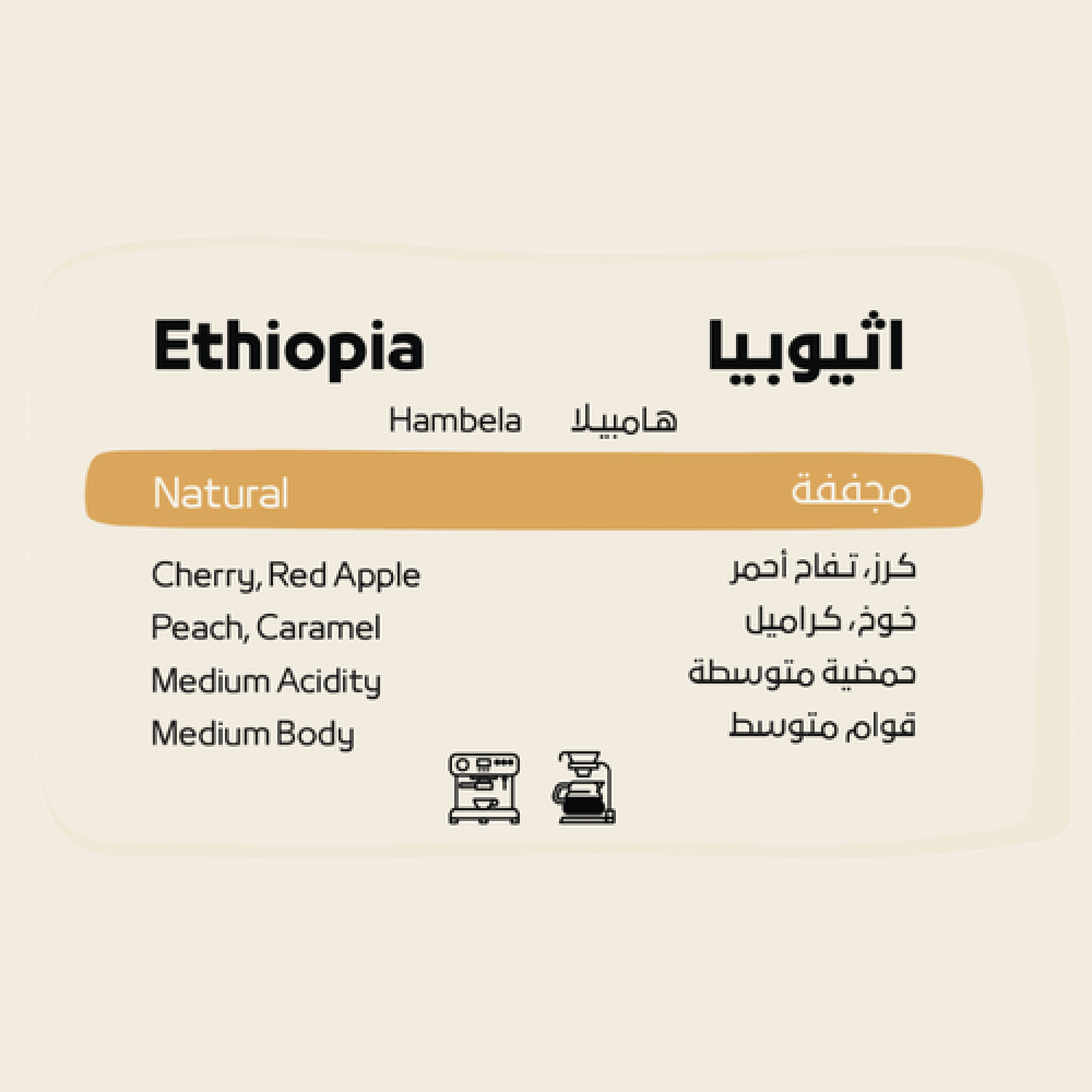 تقدم محمصة نسج قهوة هامبيلا الإثيوبية المجففة بنكهة فريدة ومميزة مزروعة على ارتفاع 2000 متر في إثيوبيا تتميز القهوة بإيحاءات الكرز والتفاح الأحمر والخوخ والكراميل مع حمضية متوسطة وقوام متوسط السلالة هيرلوم والمعالجة المجففة تضيفان طابعًا فريدًا لهذه القهوة الفاخرة تناسب جميع طرق التحضير سواء كانت فلتر أو إسبريسو