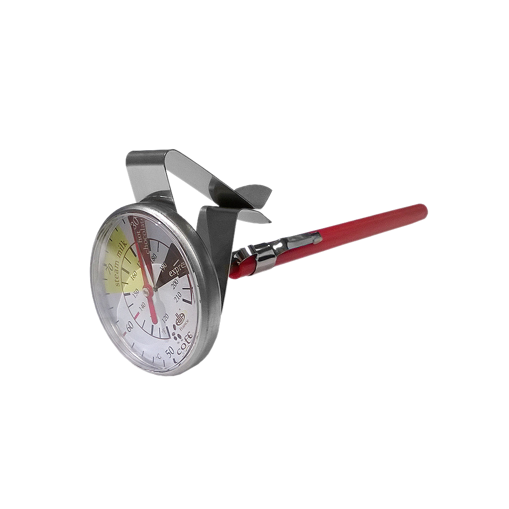 مقياس حرارة لإبريق الحليب مزود بمشبك تثبيت لسهولة الاستخدام . يتميز بنطاق درجة حرارة يتراوح بين (°C +50÷100) و(°F +120÷220) ، مما يجعله مثاليًا لمراقبة درجة حرارة الحليب أثناء التبخير لضمان قوام مثالي للمشروبات . يمكن معايرته لضمان دقة القراءة.